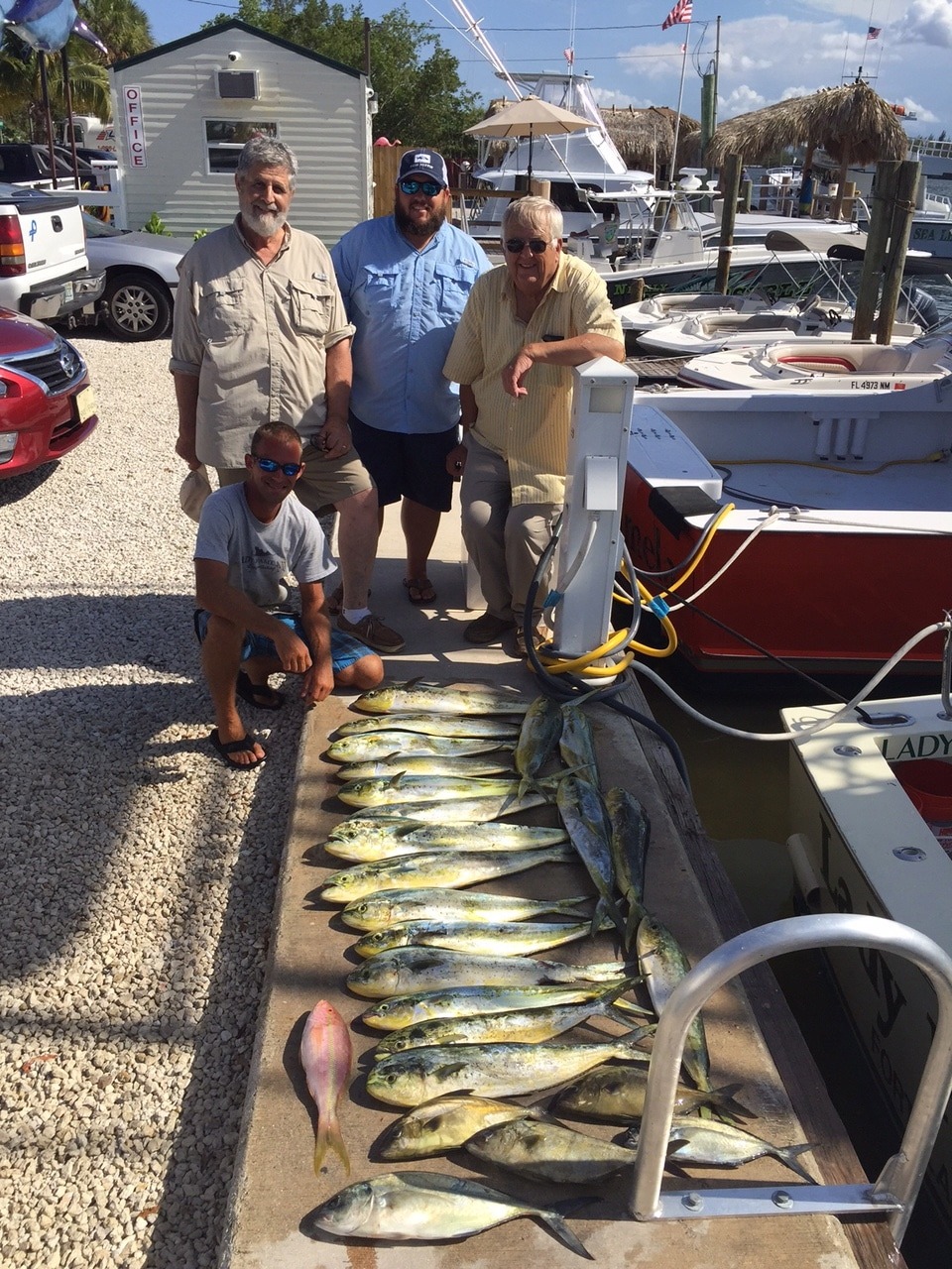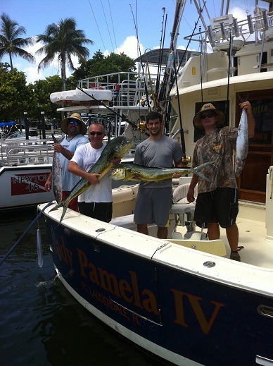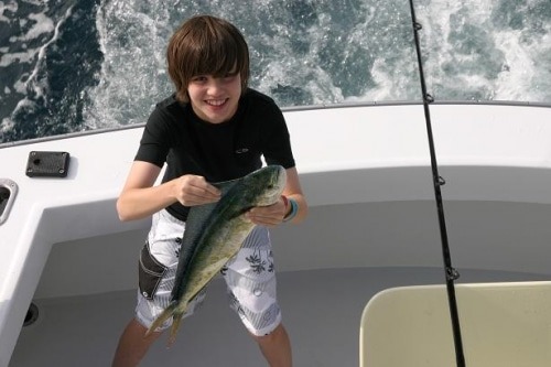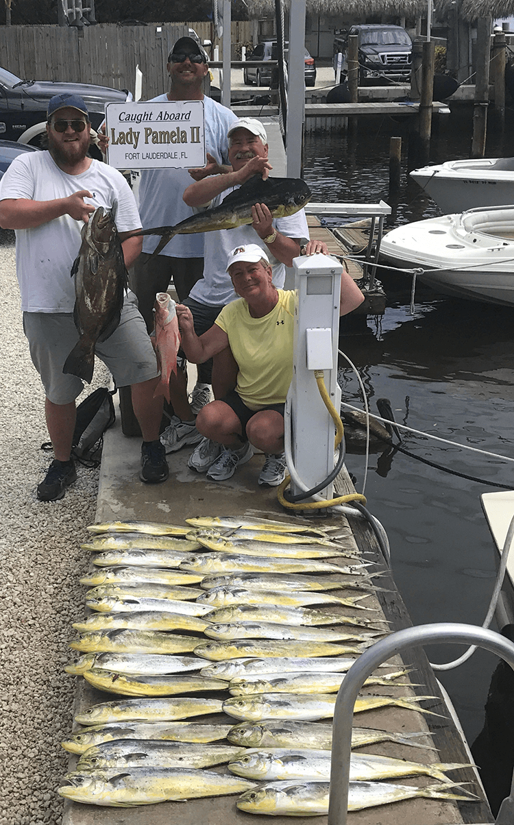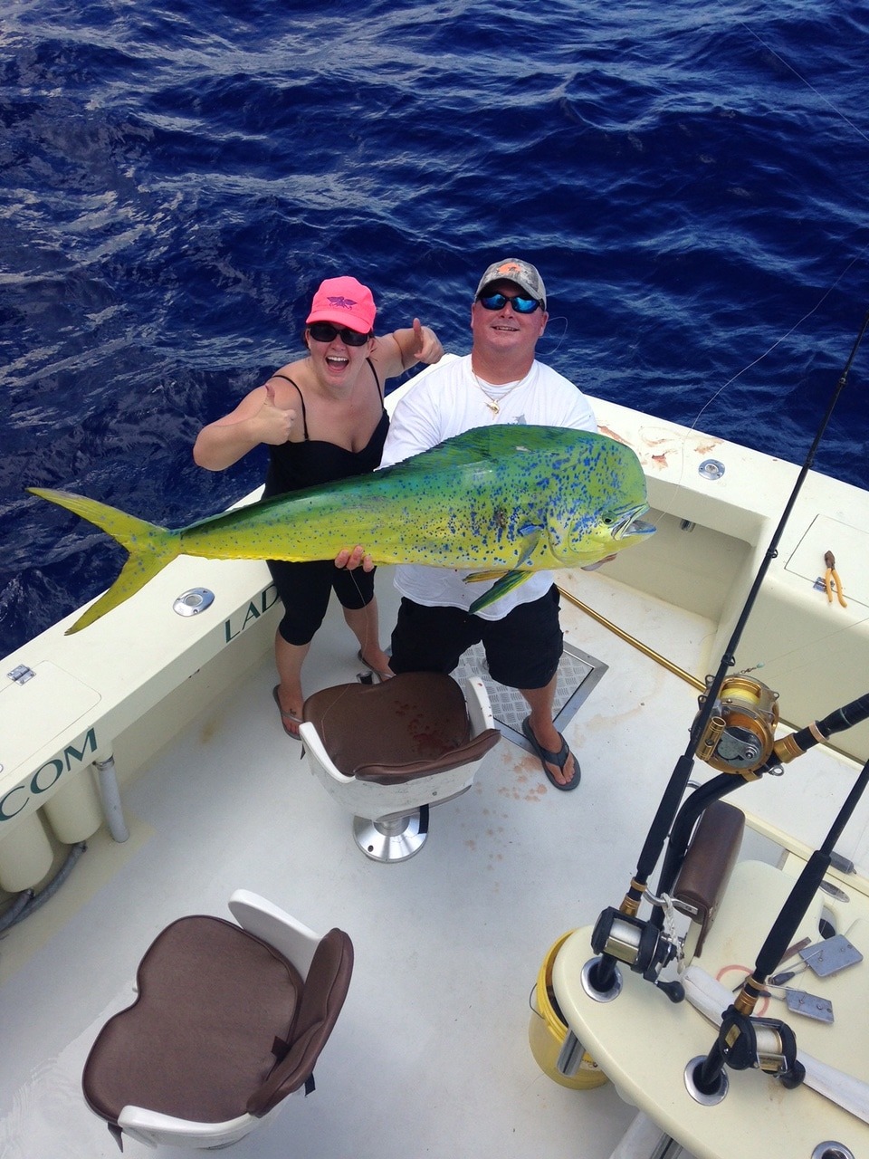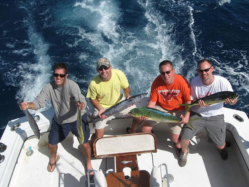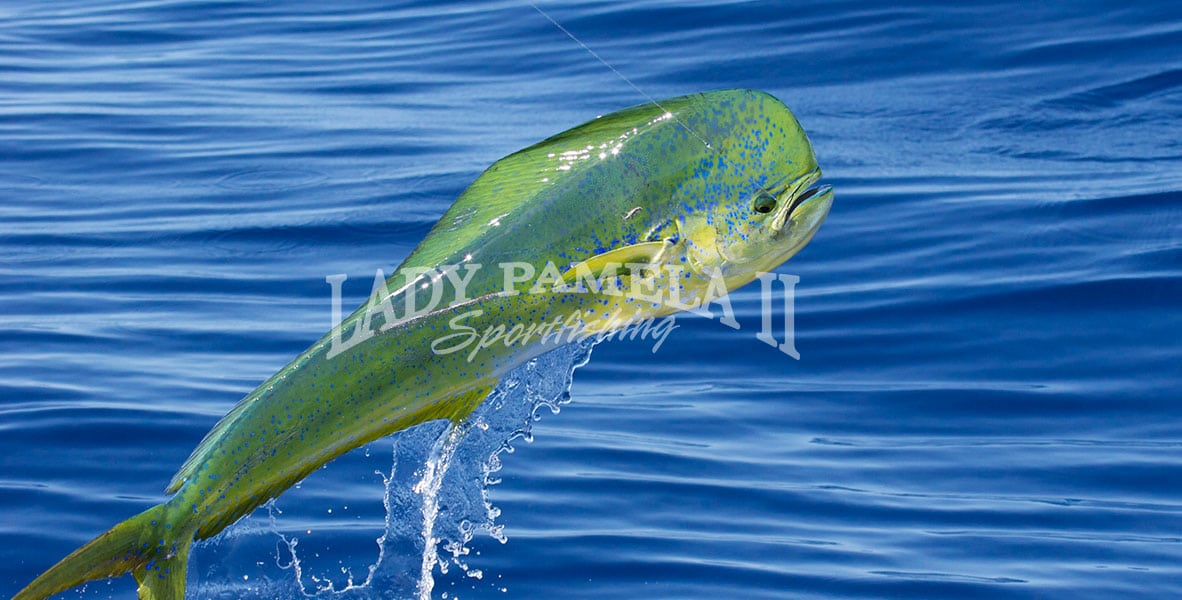 During the cooler months we don’t have to run out as far as the fishing is usually very good in the 100ft to 200ft depth range. By fishing live bait on kites we catch a variety of other species including Wahoo, Kingfish, Sailfish, White Marlin, Cobia and much more. When you see a lit-up green and gold dolphin come up on a bait, there is nothing more exciting as they are extremely fast and the jumps are exhilarating! Every vessel in the Lady Pamela Sportfishing Fleet has a tower so that we can sight-fish the Mahi and give our guests the best chance at catching the fish.