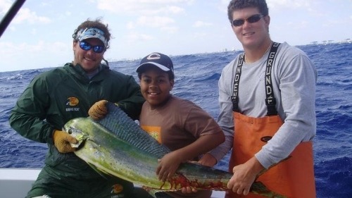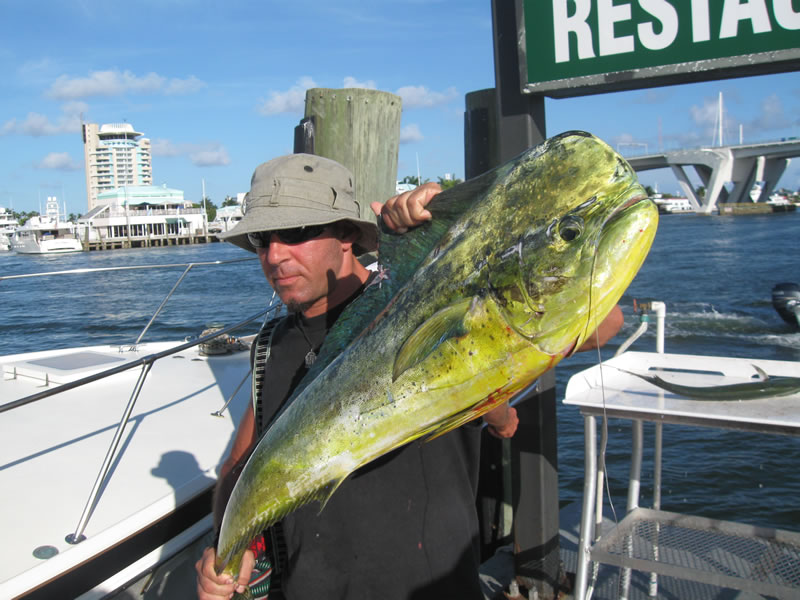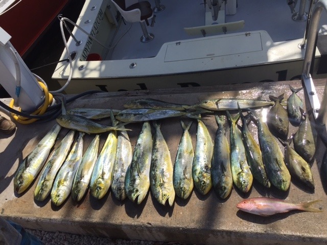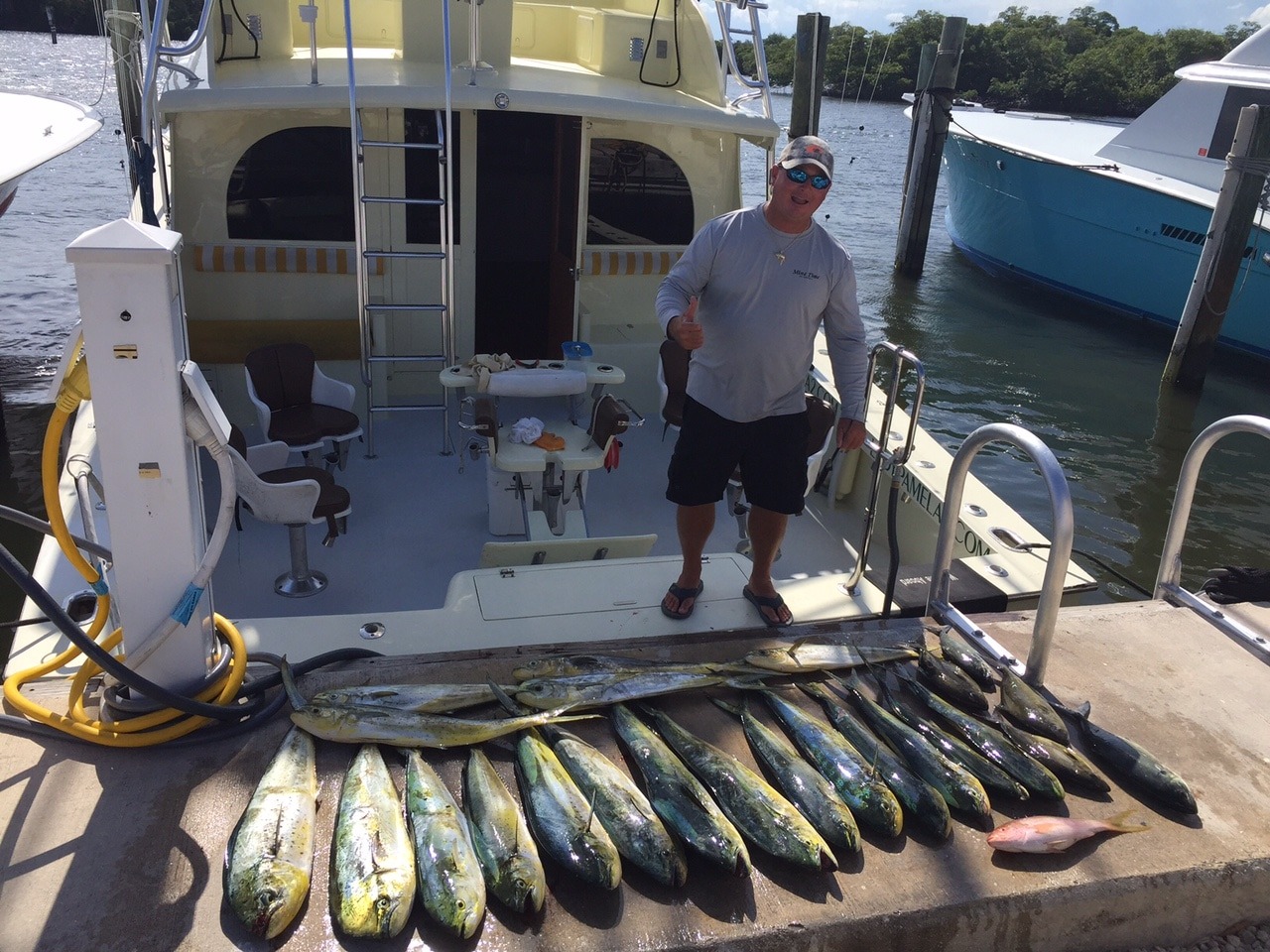 We catch Mahi ranging from 5 to 50 pounds with the biggest fish usually caught in the winter and spring months while kite fishing for sailfish. In the summertime, we’ll run offshore up to 20 miles in search of weedlines, frigate birds or floating debris. The Mahi usually hang under anything that holds bait and feed on it throughout the day.